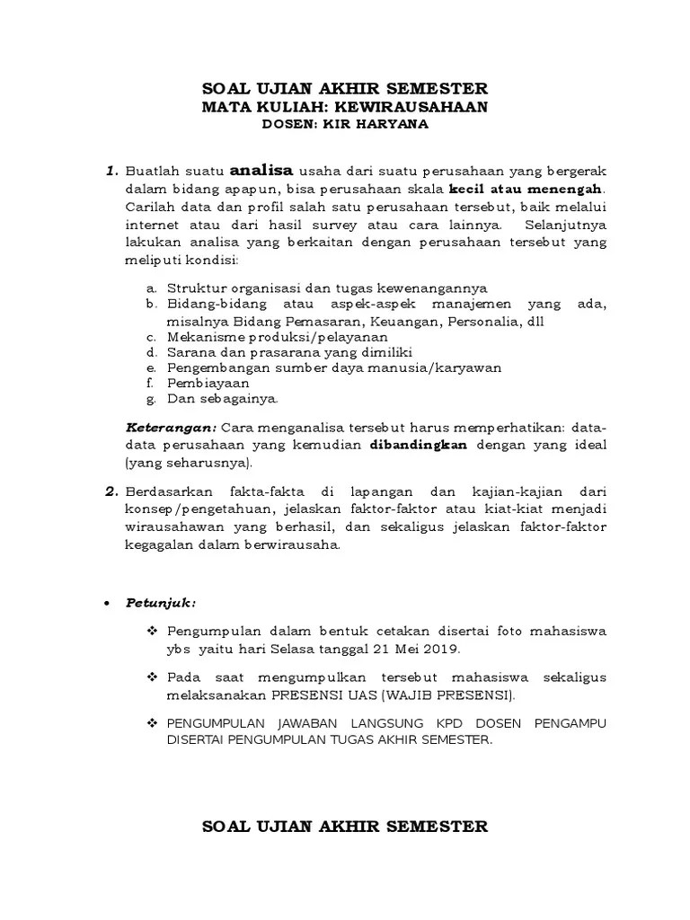 Soal uas kewirausahaan 2014 dosen bpk choirul huda. Produksi lainnnya untuk mendapatkan keuntungan yang lebih tinggi. 20200812 soal uts entrepreneur semester 2 bsi kisi kisi. Adapun soal tersebut bisa anda . Soal ujian tengah semester gasal 2011/2012.